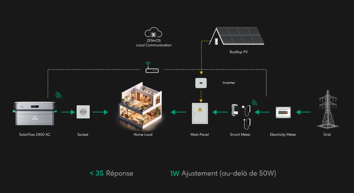 Oui, le SolarFlow 2400 AC nécessite un compteur intelligent pour surveiller en temps réel la consommation électrique du foyer et déterminer l'état de charge/décharge ainsi que la puissance correspondante. Exemple : si le compteur intelligent détecte que votre système PV existant injecte de l'énergie dans le réseau, le système active la charge. Si un excédent de 800 W est détecté, le SolarFlow 2400 AC se chargera à 800 W.